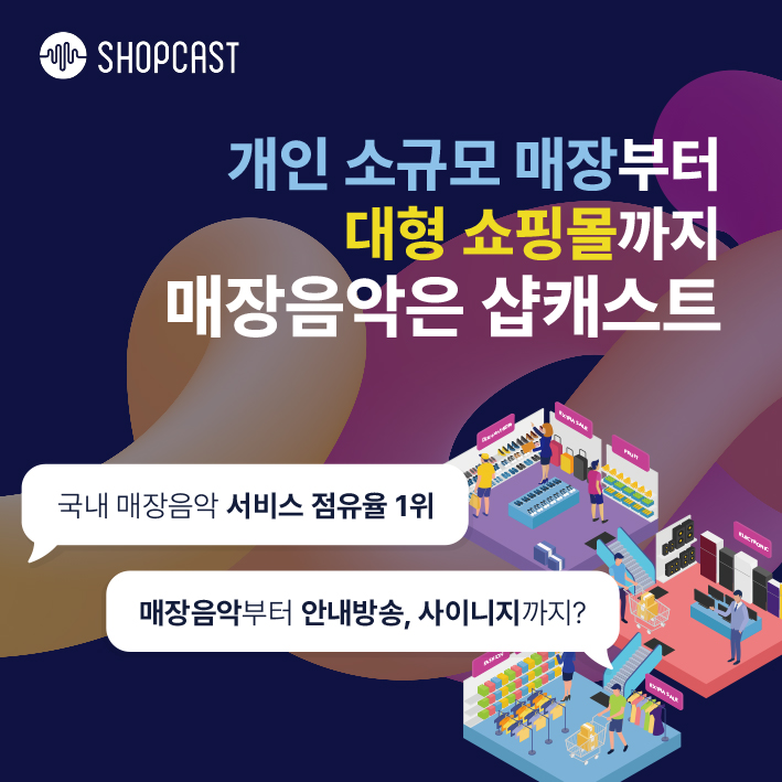 샵캐스트(대표 이정환)는 전국 350여 개 브랜드, 4만여 매장에 BGM서비스를 제공하는 국내 점유율 1위 기업으로,개인의 소규모 매장부터 대형 쇼핑몰까지 음악, 안내방송, 사이니지 등 시/청각 올인원 서비스를 제공하고 있다.샵캐스트는 브랜드 및 매장, 업종, 기업 이미지 등 여러 요소를 다각도로 고려한 전문가 큐레이션을 통해 국내 유명 브랜드의 음원 선곡을 담당하고 있으며,높은 퀄리티의 선곡 및 기술력을 인정받아 애플뮤직의 기업용 서비스의 국...