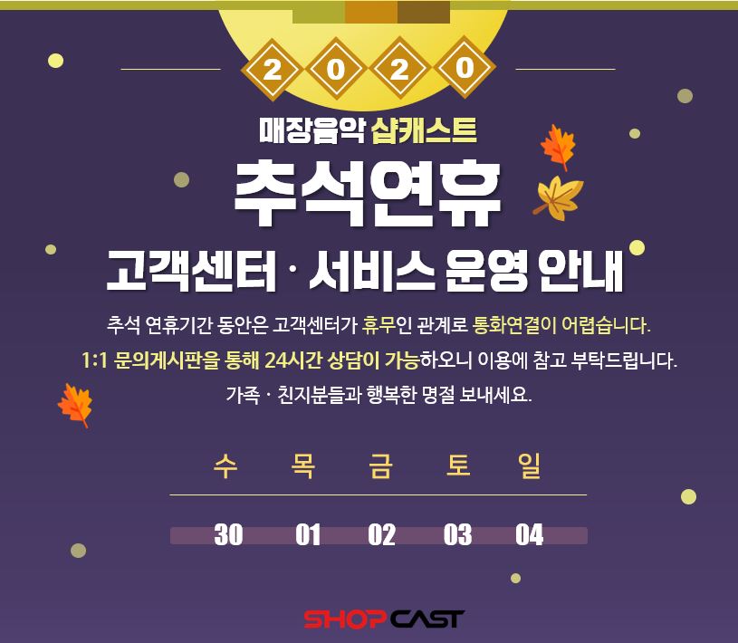 [샵캐스트] 2020年 추석 연휴 고객센터 및 서비스 운영 안내